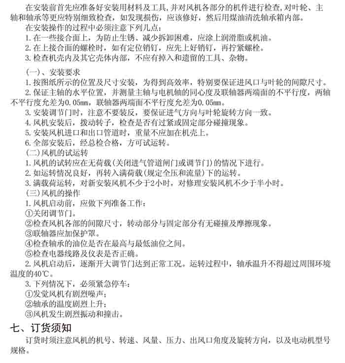 一、風機選用參考、安裝維護使用說明、常見故障分析、訂貨注意事項
